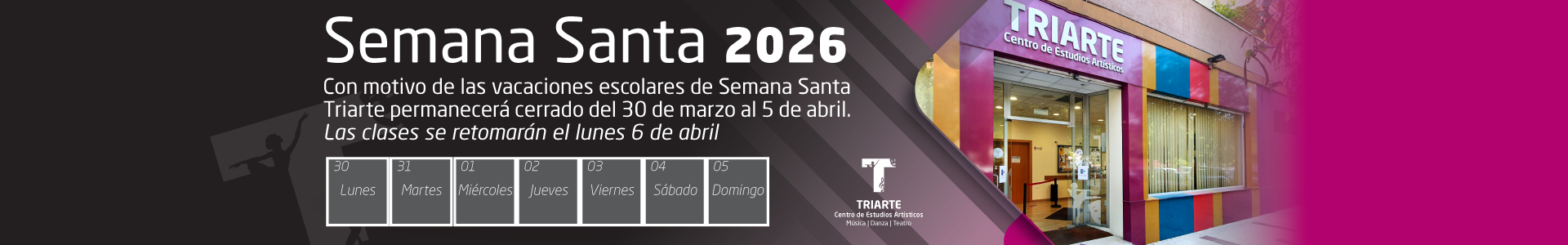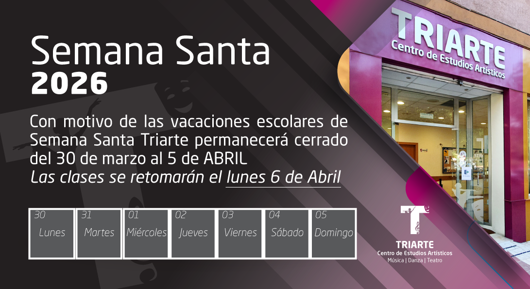 Con motivo de las vacaciones escolares de Semana Santa, Triarte permanecerá cerrado del 30 de marzo al 5 de abril. Las clases se retomarán el lunes 6 de abril.