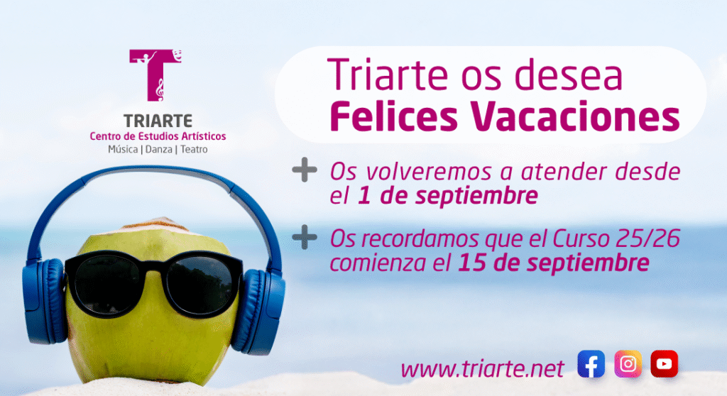 Triarte permanecerá cerrado durante el mes de agosto por vacaciones. La administración del centro abrirá a partir del 1 de septiembre. Os recordamos que el Curso 25/26 comienza el 15 de septiembre.