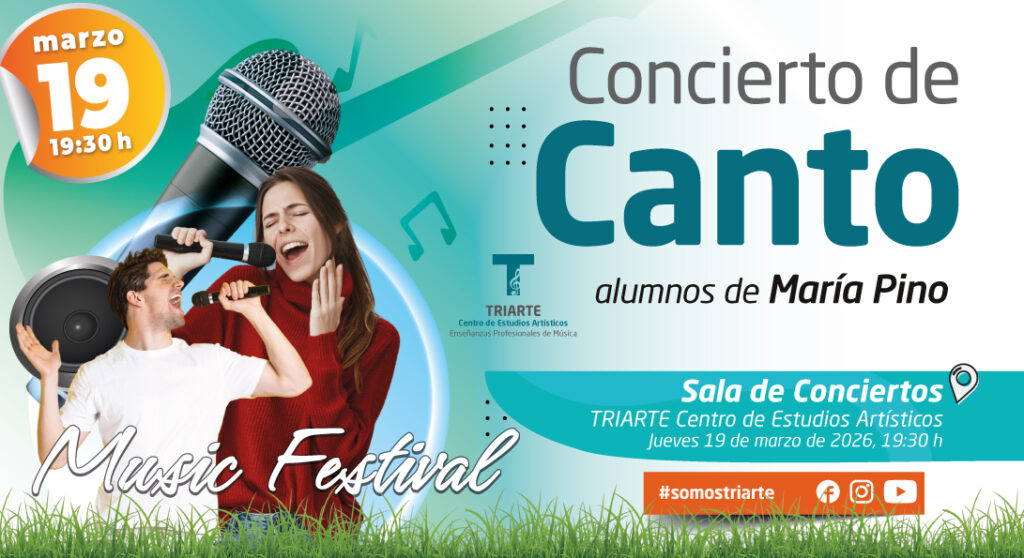 El miércoles 11 de junio a las 17:00 h los alumnos de Canto de nuestros profesores María Pino y Antonio García nos ofrecerán un concierto.